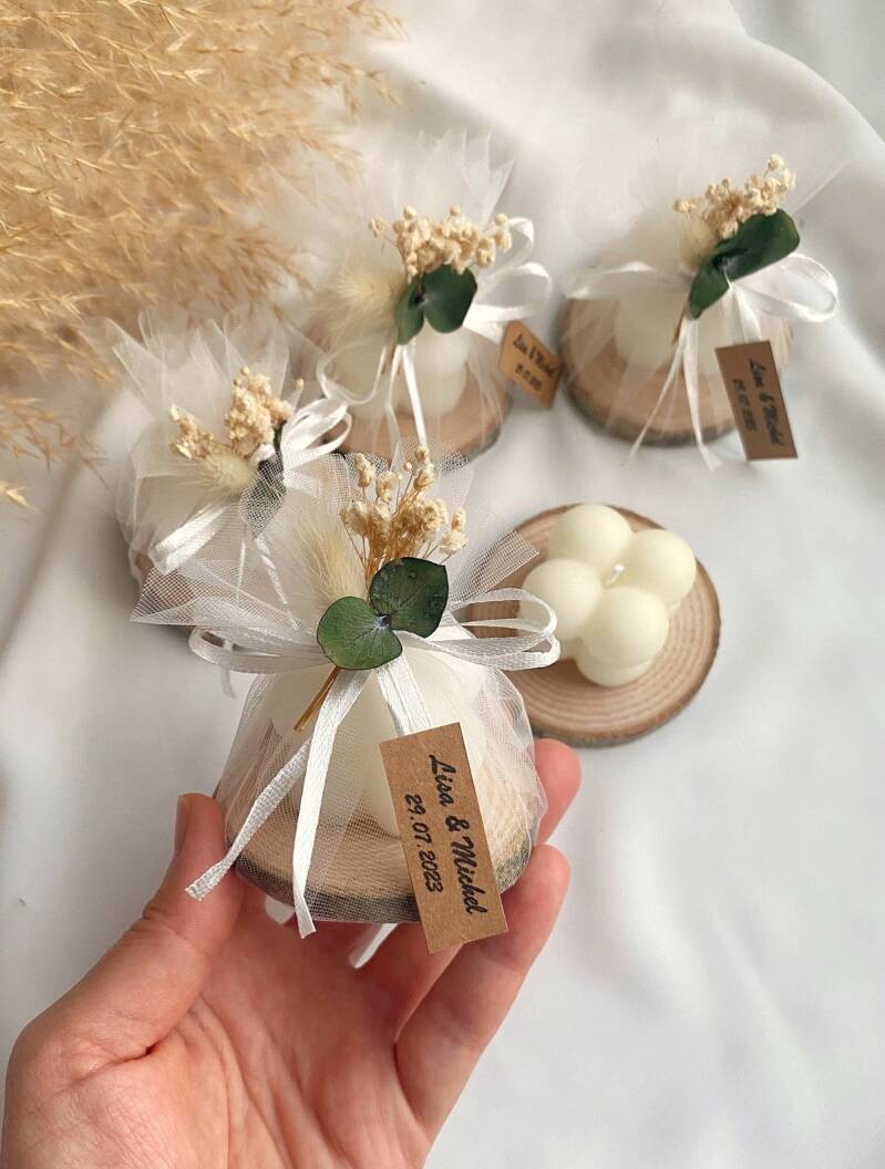 En Efimera, te brindamos la posibilidad de adaptar los detalles para tus invitados, como las etiquetas de tus velas de cera de soja, a tu gusto. Elige el diseño, añade vuestros nombres o la fecha, cada detalle está cuidadosamente personalizado para reflejar vuestra historia de amor.